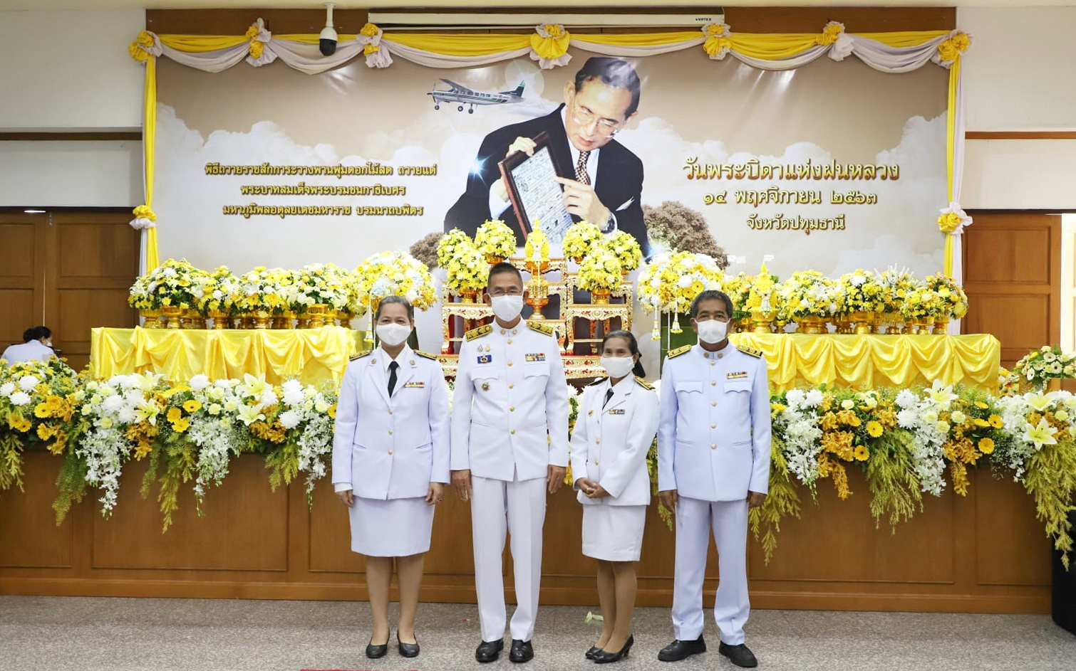 นายชัยวัฒน์ ชื่นโกสุม ผู้ว่าราชการจังหวัดปทุมธานี ประธานพิธีวางพานพุ่มดอกไม้สดถวายแด่ พระบาทสมเด็จพระบรมชนกาธิเบศร มหาภูมิพลอดุลยเดชมหาราช บรมนาถบพิตร เนื่องใน “วันพระบิดาแห่งฝนหลวง” ประจำปี ๒๕๖๓
