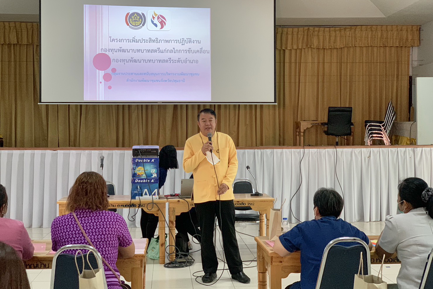 นายประจัญ จันทร์เนตร์ พัฒนาการจังหวัดปทุมธานี ได้มอบหมายให้ พ.อ.อ.ทรงพล ฉายแสง ผู้อำนวยการกลุ่มงานประสานและสนับสนุนการบริหารงานพัฒนาชุมชน และเจ้าหน้าที่จากกองทุนพัฒนาบทบาทสตรีจังหวัดปทุมธานี เป็นวิทยากรบรรยายให้ความรู้แก่คณะทำงานขับเคลื่อนกองทุนพัฒนาบทบาทสตรีอำเภอหนองเสือ ตามโครงการเพิ่มประสิทธิภาพการปฏิบัติงานกองทุนพัฒนาบทบาทสตรีแก่กลไกการขับเคลื่อนกองทุนพัฒนาบทบาทสตรี อำเภอหนองเสือ โดยมีนางสาวอัญชัญ คุ้มวงษ์ พัฒนาการอำเภอหนองเสือ และเจ้าหน้าพัฒนาชุมชนอำเภอหนองเสือ พร้อมกลุ่มเป้าหมาย ซึ่งประกอบด้วยคณะทำงานขับเคลื่อนกองทุนพัฒนาบทบาทสตรีตำบล/เทศบาล จำนวน ๓๐ คน เข้าร่วมโครงการดังกล่าว เพื่อสร้างความรู้ ความเข้าใจเกี่ยวกับแนวทางการดำเนินงาน และกฏ ระเบียบที่เกี่ยวข้องกับกองทุนพัฒนาบทบาทสตรี แก่คณะทำงานขับเคลื่อนกองทุนพัฒนาบทบาทสตรีอำเภอหนองเสือ จังหวัดปทุมธานี