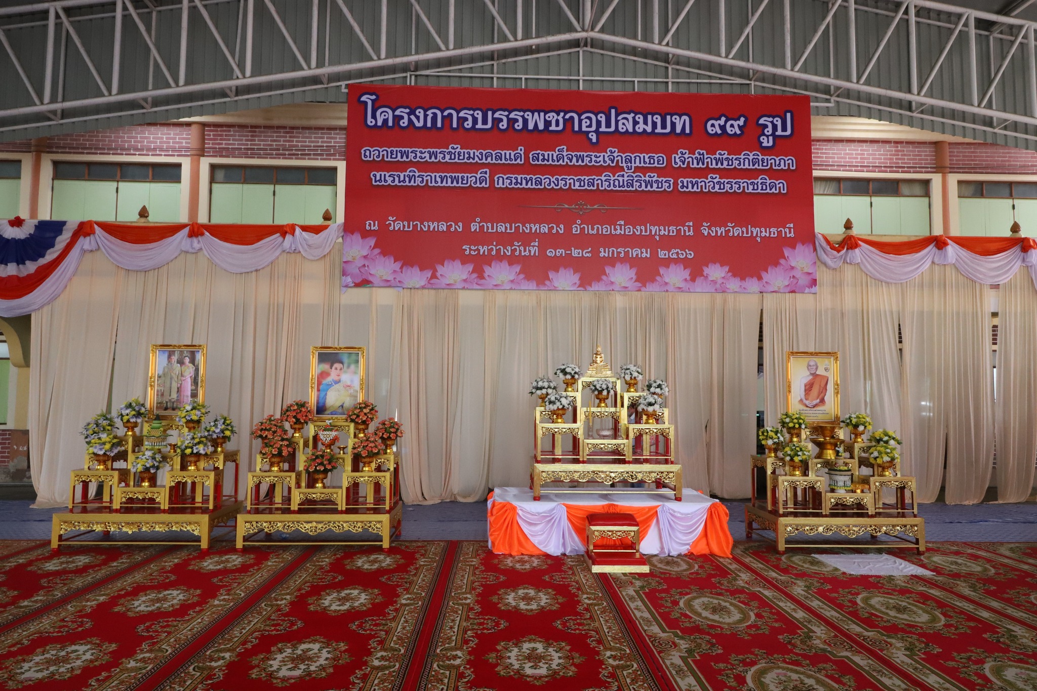 โดยในพิธีฯ นายณรงค์ศักดิ์ โอสถธนากร ผู้ว่าราชการจังหวัดปทุมธานี นำผู้ร่วมพิธีจุดธูปเทียนบูชาพระรัตนตรัย ถวายดอกไม้ธูปเทียนแพหน้าพระรูปสมเด็จพระอริยวงศาคตญาณ สมเด็จพระสังฆราช สกลมหาสังฆปริณายก หน้าพระบรมฉายาลักษณ์พระบาทสมเด็จพระเจ้าอยู่หัว และสมเด็จพระนางเจ้าฯ พระบรมราชินี และหน้าพระรูปสมเด็จพระเจ้าลูกเธอ เจ้าฟ้าพัชรกิติยาภา นเรนทิราเทพยวดี กรมหลวงราชสาริณีสิริพัชร มหาวัชรราชธิดา และถวายเครื่องสักการะแด่ประธานฝ่ายสงฆ์ พระมหาถาวร ถิรจิตโต เจ้าคณะอำเภอเมืองปทุมธานี เจ้าอาวาสวัดบางหลวง