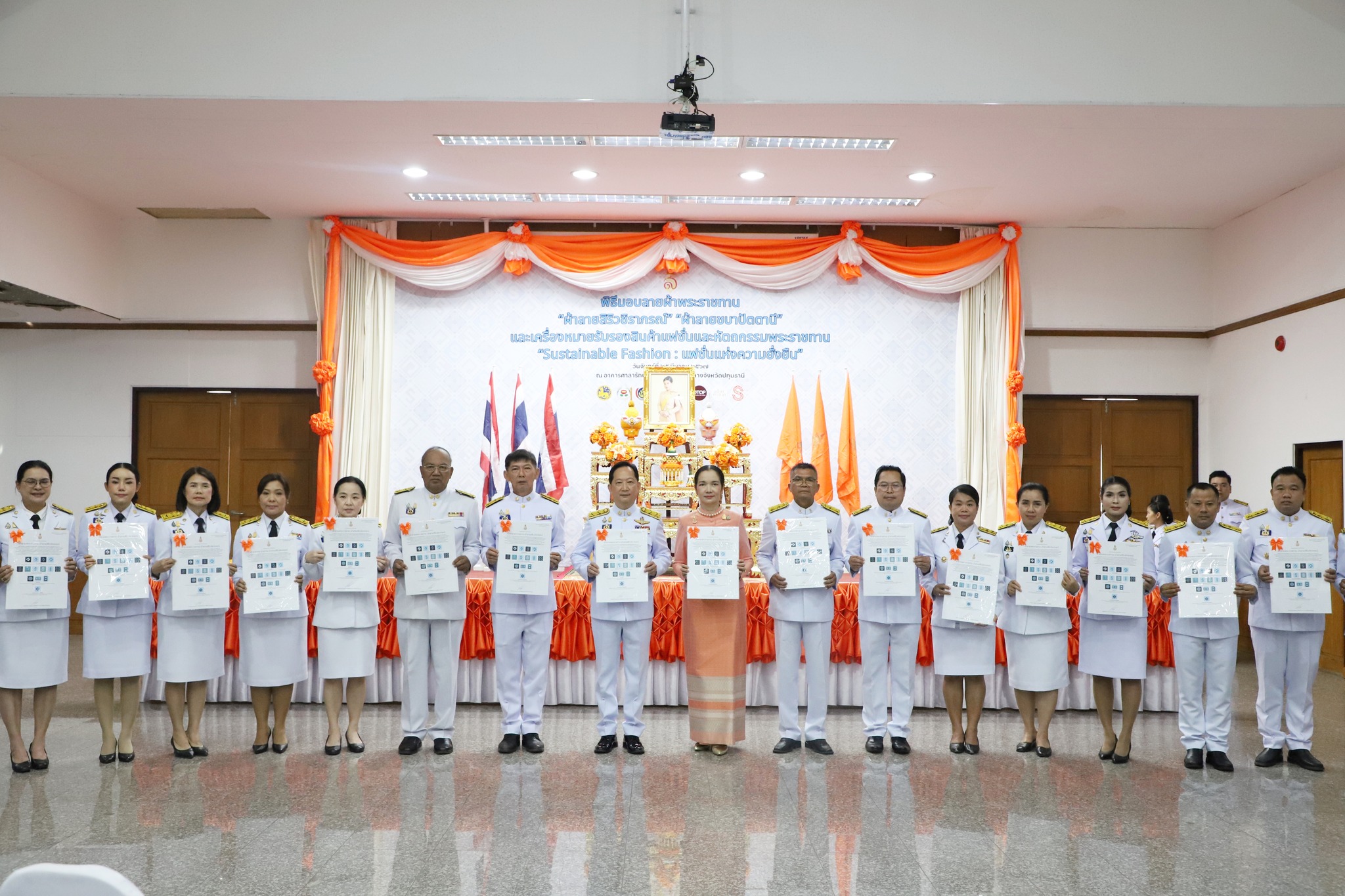 นายภาสกร บุญญลักษม์ ผู้ว่าราชการจังหวัดปทุมธานี เป็นประธานพิธีมอบแบบลายผ้าพระราชทาน “ผ้าลายสิริวชิราภรณ์” และเครื่องหมายรับรองสินค้าแฟชั่นและหัตถกรรมพระราชทาน “Sustainable Fashion : แฟชั่นแห่งความยั่งยืน” ให้แก่ กลุ่มผู้ผลิต ผู้ประกอบการด้านผ้าของจังหวัดปทุมธานี พร้อมด้วยนางบุษบา บุญญลักษม์ ประธานแม่บ้านมหาดไทยจังหวัดปทุมธานี โดยมี นายคมสัน ญาณวัฒนา รองผู้ว่าราชการจังหวัดปทุมธานี นางสาววัชรินทร์ มิ่งขวัญรุ่งเรือง หัวหน้าสำนักงานจังหวัดปทุมธานี นายประจัญ จันทร์เนตร์ พัฒนาการจังหวัดปทุมธานี นายนิมิตร ฆังคะจิตร พานิชย์จังหวัดปทุมธานี นายนิมิตร ฆังคะจิตร พานิชย์จังหวัดปทุมธานี นางลัษมา ธารีเกษ วัฒนธรรมจังหวัดปทุมธานี นางเสาวรีย์ อัมภสุวรรณ์ ประชาสัมพันธ์จังหวัดปทุมธานี หัวหน้าส่วนราชการ นายอำเภอ ๗ อำเภอ มหาวิทยาลัย วิทยาลัยอาชีวศึกษา และกลุ่มผู้ประกอบการ OTOP ประเภทผ้าเครื่องแต่งกาย ช่างทอผ้า และช่างหัตถกรรม จำนวน ๑๕ กลุ่ม รวมทั้งสิ้น ๔๐ ราย เข้าร่วมมอบแบบลายผ้าพระราชทาน ฯ