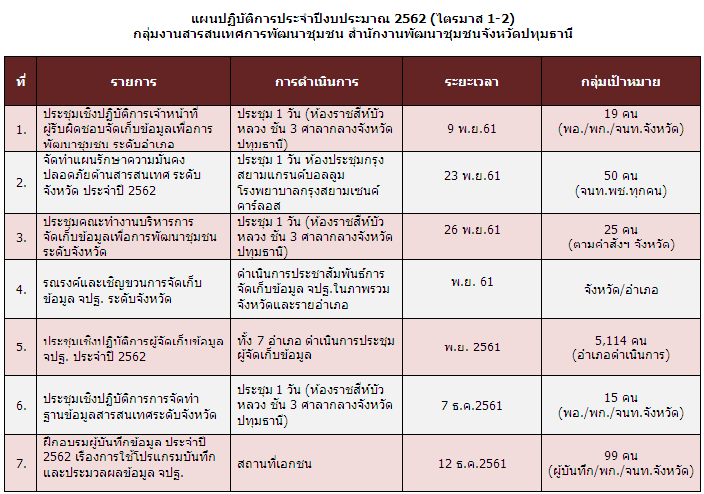 แผนปฏิบัติการประจำปีงบประมาณ 2562 ไตรมาส 1-2 กลุ่มงานสารสนเทศการพัฒนาชุมชน สำนักงานพัฒนาชุมชนจังหวัดปทุมธานี