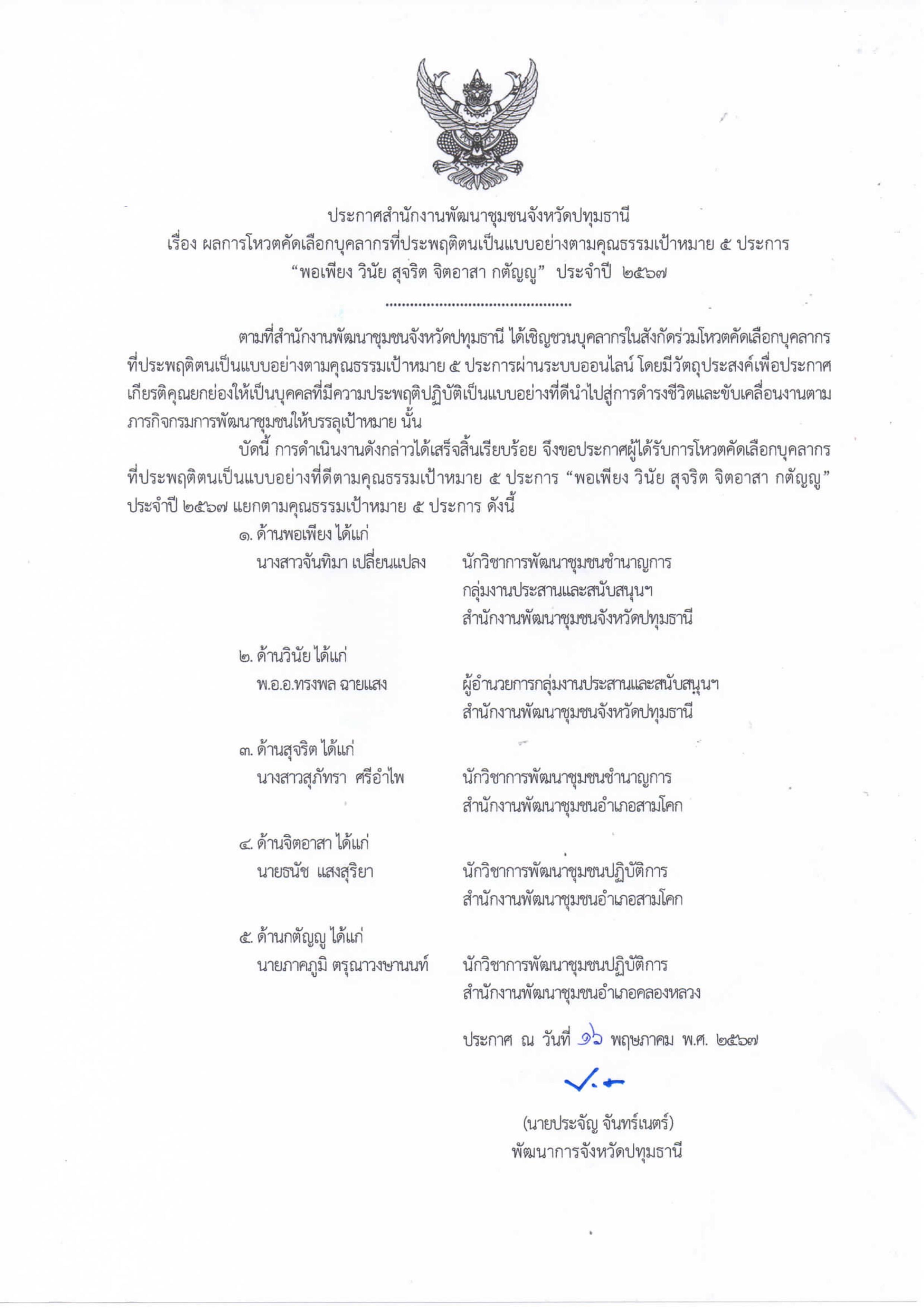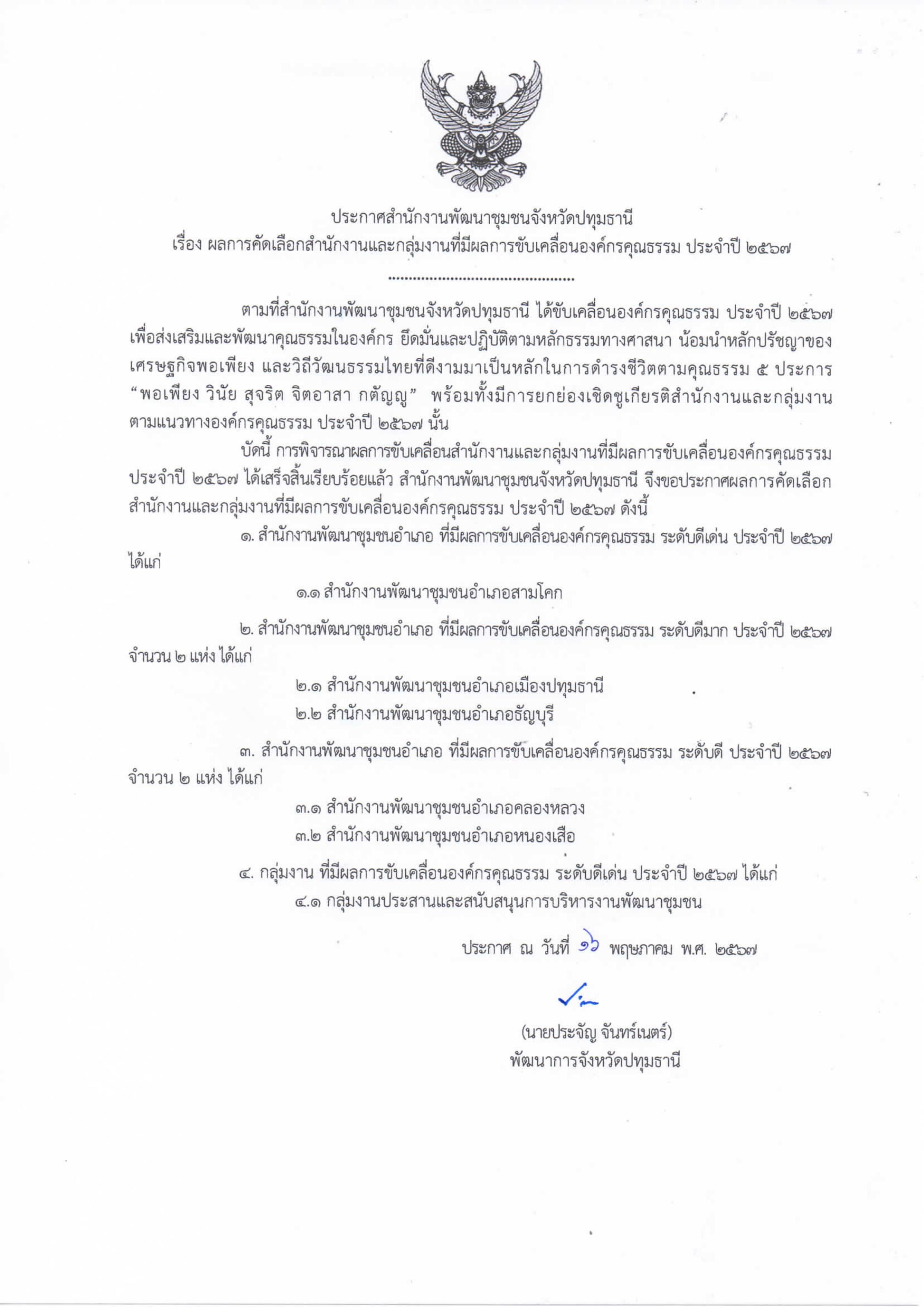 ประกาศจังหวัดปทุมธานี เรื่อง ผลการคัดสรรกิจกรรมพัฒนาชุมชนดีเด่น ระดับจังหวัด ประจำปี ๒๕๖๗